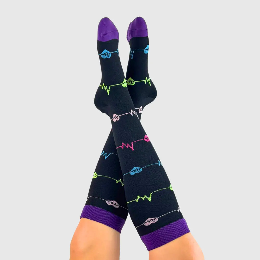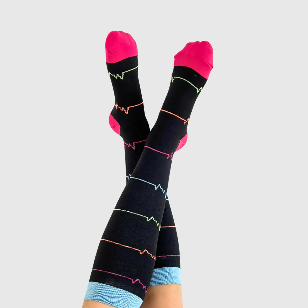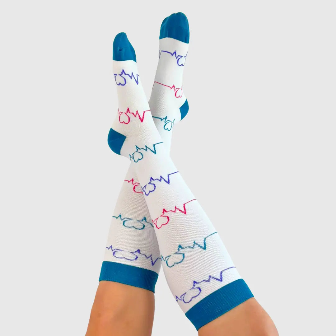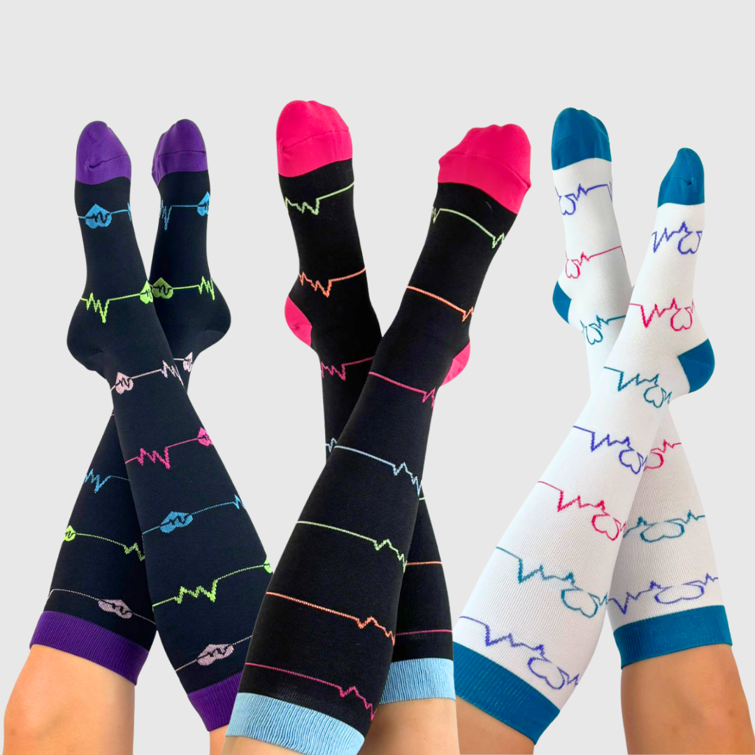 A nossa marca nasceu do contacto com a realidade dura e silenciosa que muitos profissionais de saúde e de tantas outras áreas enfrentam: dias longos, pernas pesadas, cansaço acumulado. Sentimos que era preciso mais. Mais cor. Mais leveza. Mais cuidado com quem cuida.