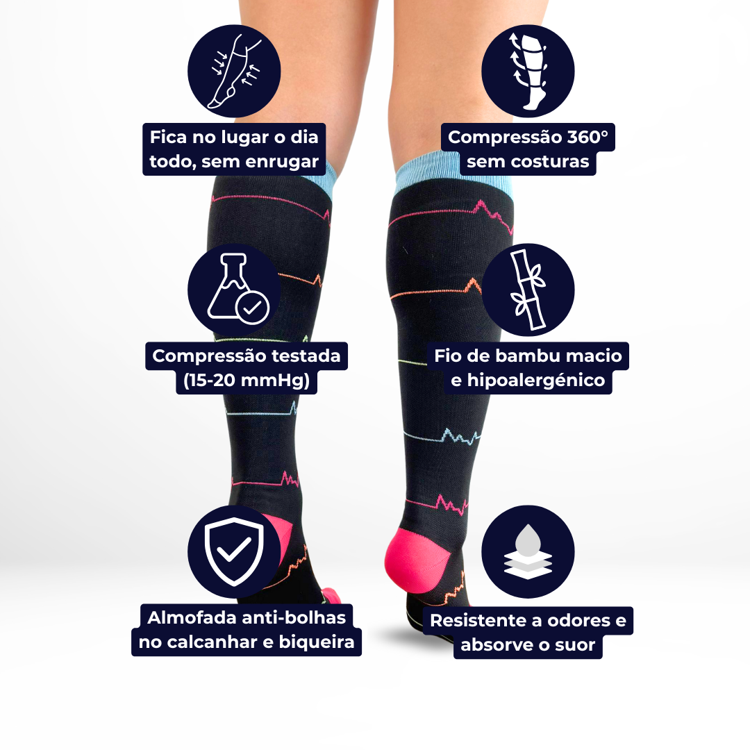 Exercem uma pressão suave e gradual nas pernas, mais forte junto ao tornozelo e a diminuir à medida que sobe. Isso ajuda a dar mais conforto no dia a dia ou durante longas horas de pé.