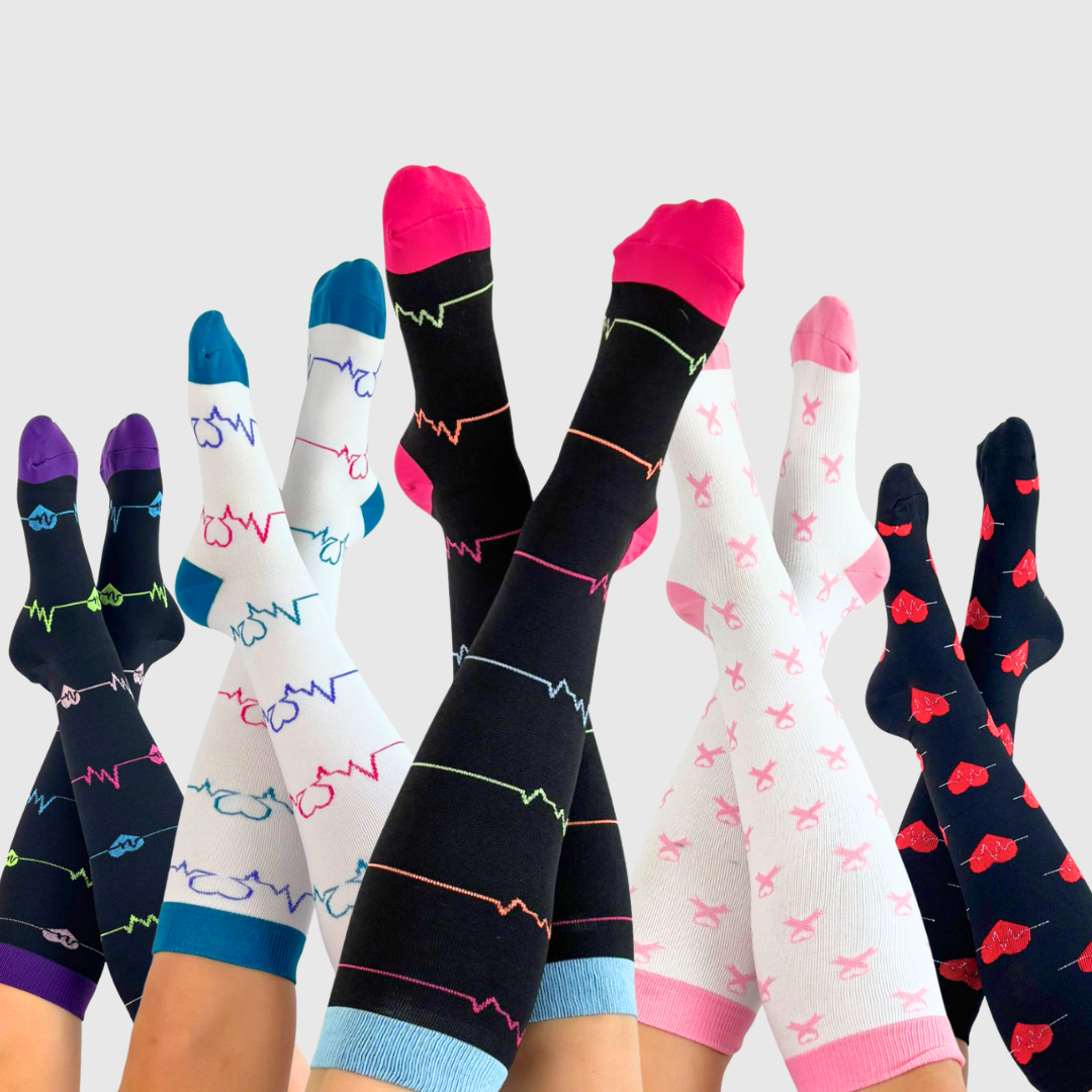 A nossa marca nasceu do contacto com a realidade dura e silenciosa que muitos profissionais de saúde e de tantas outras áreas enfrentam: dias longos, pernas pesadas, cansaço acumulado. Sentimos que era preciso mais. Mais cor. Mais leveza. Mais cuidado com quem cuida.
